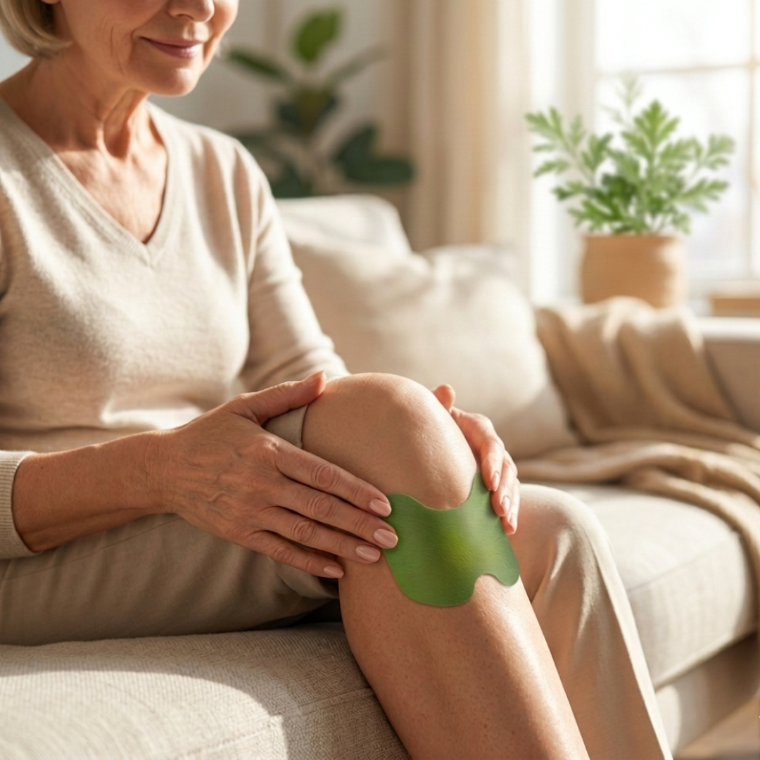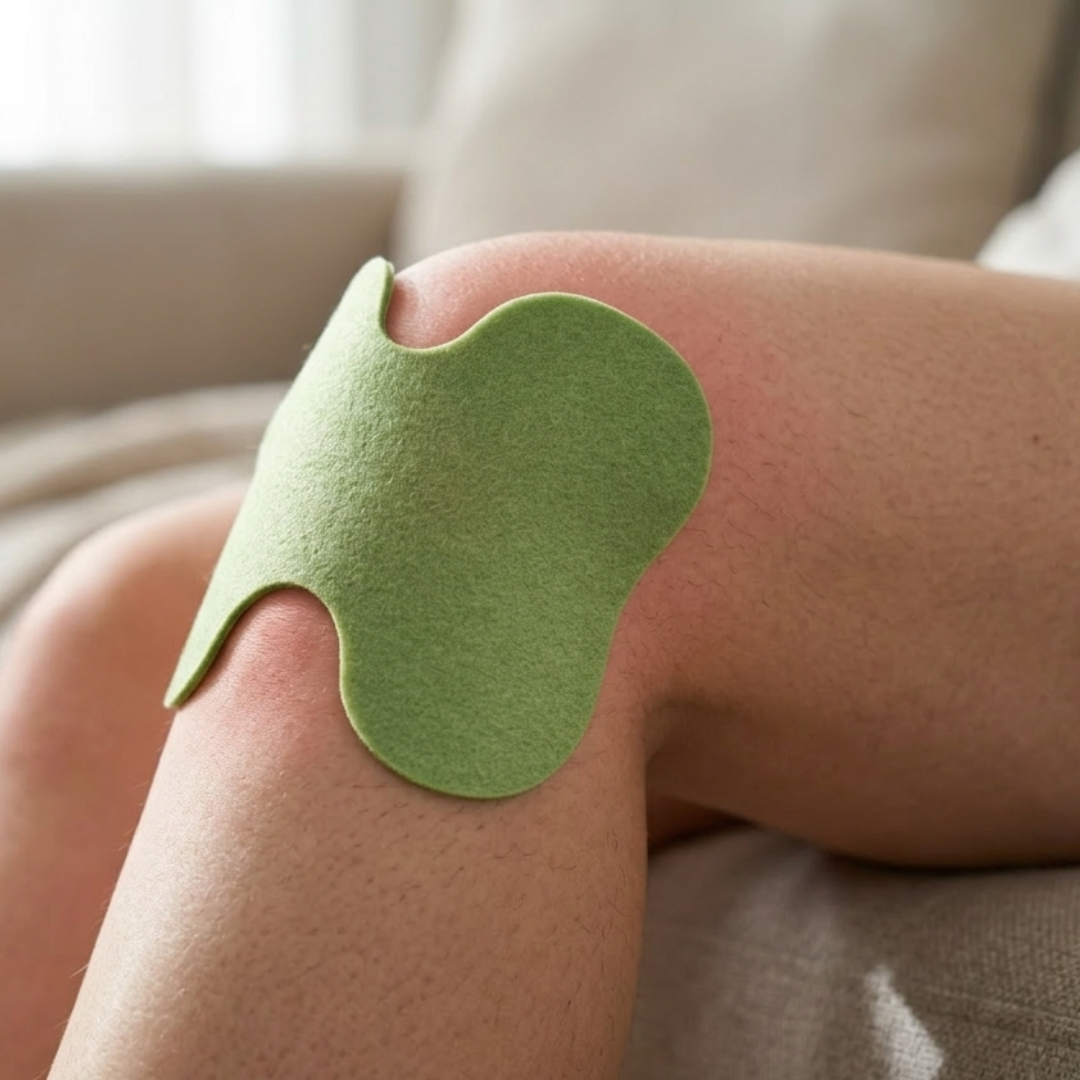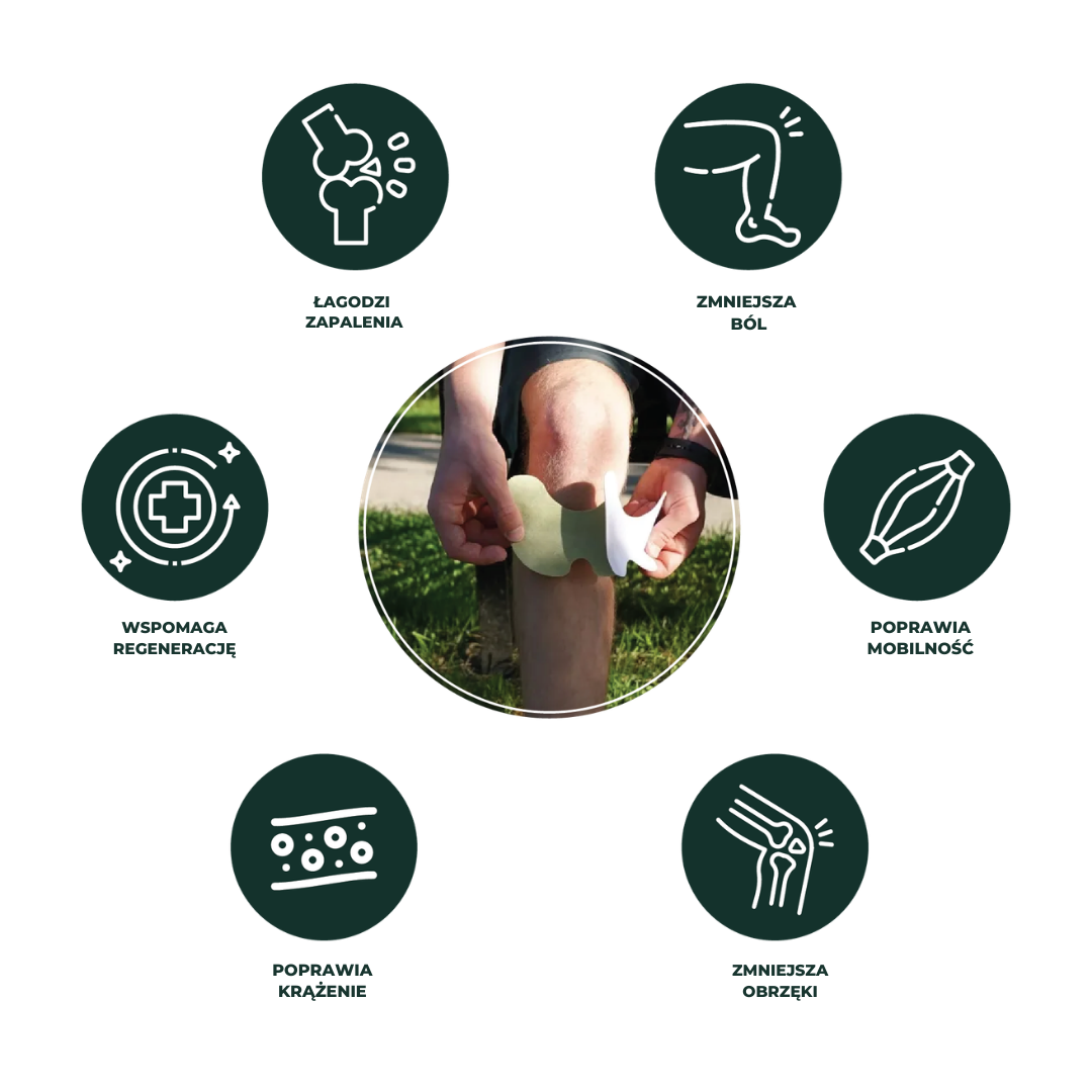 Przyklej plaster dokładnie na kolano — najlepiej tuż pod rzepką, gdzie wchłanianie jest najlepsze.